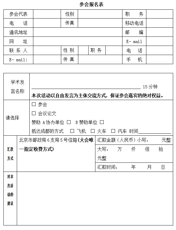 (一)、参会嘉宾请详细填写好《参会报名表》,同身份证(正反面)复印件、免冠照片两寸照片两张,报名费500元(报到时再交1800元即可);于2014年5月20之前邮至组委会北京市邮政局6支局5号信箱。《参会报名表》、身份证复印件、照片也可发至:zhouyichina@163.com 。